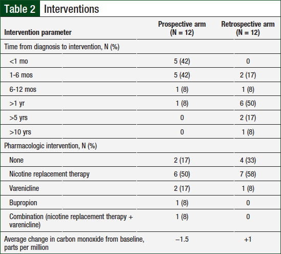 Pharmacologic interventions were assessed in both groups (Table 2). In the prospective arm, 10 patients received pharmacologic interventions compared with 8 patients in the retrospective arm. Of the total population, the most common agents used were nicotine-replacement therapies and varenicline.