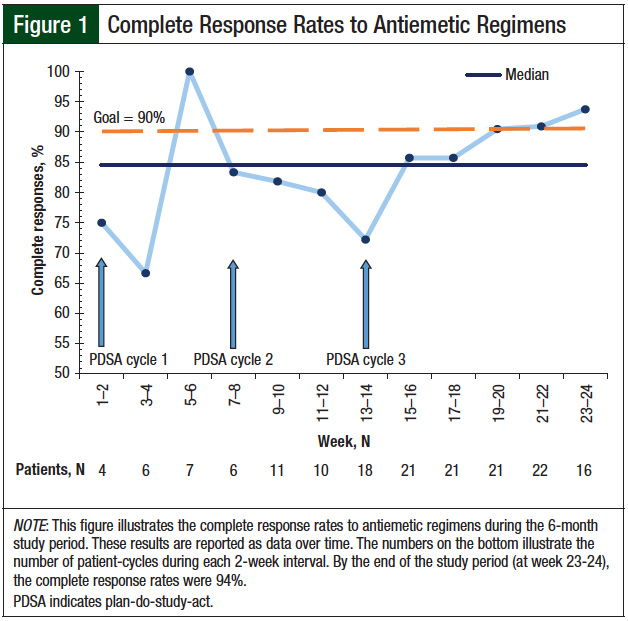The study’s outcome measure was complete response to antiemesis drugs (as measured by the absence of emesis). The complete response rates were calculated by dividing the number of patients who did not have CINV at day 3 and 5, by the total number of patients being treated that week. As a marker to confirm a high success rate throughout this initiative, an initial goal of 90% response (ie, lack of emesis) rate was chosen.