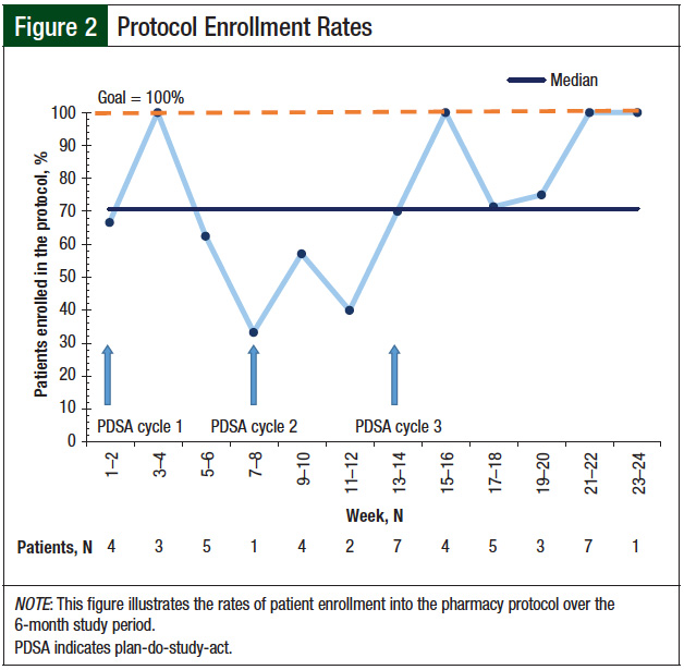 A second PDSA cycle was implemented to increase the providers’ use of the protocol. The complete response rates for patients in each 2-week interval after the implementation of cycle 2 were 83% (5/6), 82% (9/11), 80% (8/10), and 72% (13/18). These declining complete response rates were thought to be attributed to an inadequate understanding of how to enroll patients in the pharmacy protocol. Thus, PDSA cycle 3 was designed to improve the understanding of the enrollment process and the electronic order referrals with certain providers.
