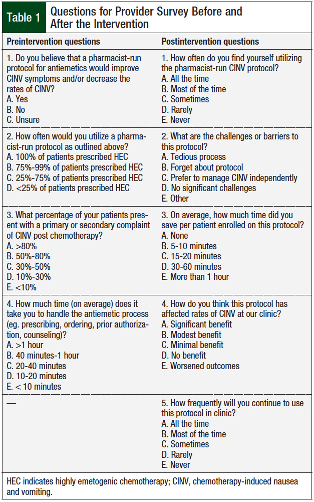 Before the implementation of this improvement protocol, antiemetic medication prescribing was handled solely by attending physicians. Providers often consulted the pharmacists on complex cases or when there was a problem in obtaining medications. Antiemetic drugs were often prescribed and sent to outside pharmacies, which would create a gap in communication if a prior authorization was needed. Patients would frequently leave the clinic after their chemotherapy, without picking up their medications, because of various barriers, such as lack of transportation or a lack of understanding the importance of taking antiemetic drugs.