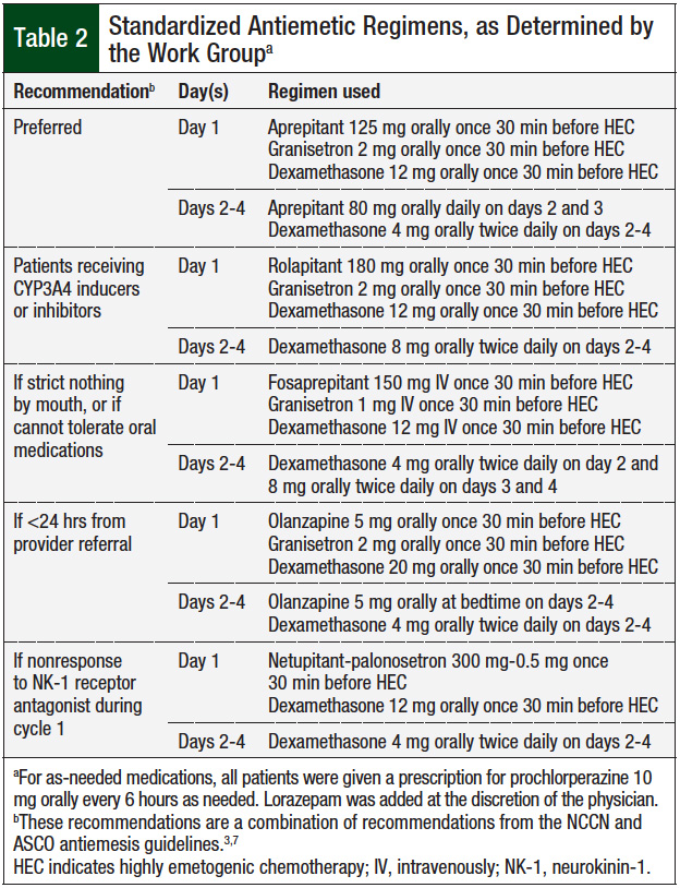 In addition, patients referred for management through the pharmacy protocol within 24 hours before the first chemotherapy cycle might not have had prior authorizations completed and might have received alternative therapy using an olanzapine-based regimen from our standardized protocol as opposed to a neurokinin-1 antagonist.