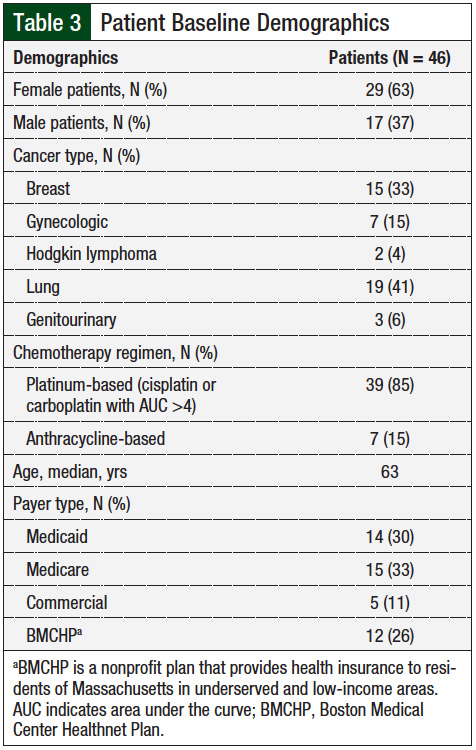 The pharmacists initiated the protocol for eligible patients by prescribing antiemetic drugs according to a standardized regimen that was determined by the Work Group (Table 2). This regimen incorporated recommendations from the NCCN3 and the American Society of Clinical Oncology.7 The pharmacists completed all prior authorizations (with assistance from pharmacy liaisons) for the antiemetic drug regimen, prescribed the antiemetic drugs, delivered medications dispensed by Boston Medical Center’s outpatient pharmacies, and performed comprehensive medication counseling, with an interpreter when appropriate. Medication counseling included reviewing the dosing, administration, and toxicity of the antiemetic agents, as well as reviewing the chemotherapy regimen itself.
