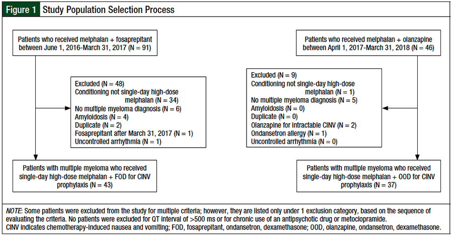 Patients were included in this review if they had a diagnosis of multiple myeloma and received single-day high-dose melphalan for autologous HSCT (Figure 1). Patients were excluded from the study if they had a diagnosis of amyloidosis, had a corrected QT interval of >500 ms, as measured by an electrocardiogram before autologous HSCT, had chronic antipsychotic drug or metoclopramide use, or had uncontrolled arrhythmia.