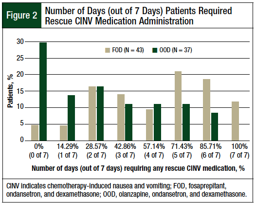 To investigate whether the OOD regimen leads to a decreased proportion of days requiring rescue medication for CINV compared with the FOD regimen, we used a 2-tailed Wilcoxon rank-sum test.