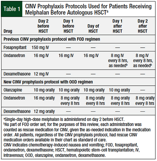 The new protocol, which was put into effect in April 2017, consists of a regimen of olanzapine, ondansetron, and dexamethasone (OOD), in which all medications are preferentially administered orally. Ondansetron administration is scheduled around the clock to mimic the longer duration of action of palonosetron, because the latter was not available in the inpatient setting at our institution. Before the implementation of this protocol, a prophylaxis regimen consisting of fosaprepitant, ondansetron, and dexamethasone (FOD) had been used, in which all medications were preferentially administered intravenously. At the time of implementation, our institution had approximately 60 to 70 patients with multiple myeloma who received treatment, annually, in our 15-bed bone marrow transplant unit. Almost all the patients with multiple myeloma who received single-day high-dose melphalan at our institution had additional risk factors that would necessitate the addition of an NK-1 receptor antagonist to their CINV prophylaxis.