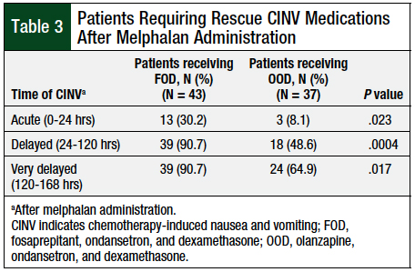 The results of this retrospective review show that treatment with an olanzapine-based 3-drug CINV prophylaxis regimen results in a significant decrease in the number of days requiring administration of rescue medication for CINV within 7 days after receiving melphalan compared with a fosaprepitant-based CINV prophylaxis regimen.