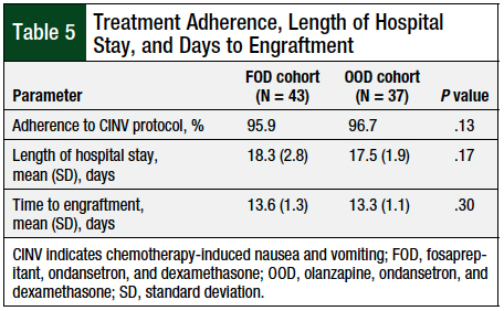 The median time to engraftment was approximately 13.5 days for both cohorts, with a range of 11 to 19 days for FOD, and 11 to 16 for OOD. There was no significant difference between the mean time to engraftment between the 2 cohorts (Table 5).