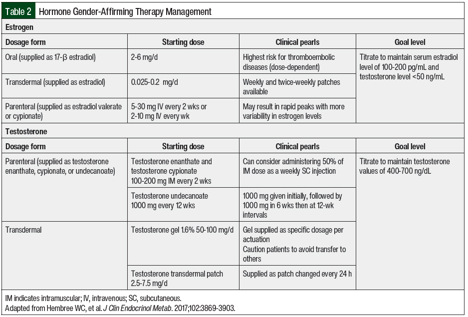 Hormone therapy is considered a medically necessary treatment for transgender adults seeking gender-affirming therapy. Although individual targets of hormone therapy may differ among individuals, the overall goals of therapy are to decrease endogenous sex hormones, reduce secondary sex characteristics, and increase exogenous sex hormones to maintain hormone levels consistent with gender identity.10-12 In adolescents, goals may also include suppressing pubertal development to minimize secondary sex characteristics. Hormone therapy is often initiated after an individual has undergone a psychosocial assessment and screening for medical issues, as well as an assessment for social barriers that could impair adherence to treatment.10 Specific dosing recommendations, formulations, and the desired target levels for hormone therapy are shown in Table 2.