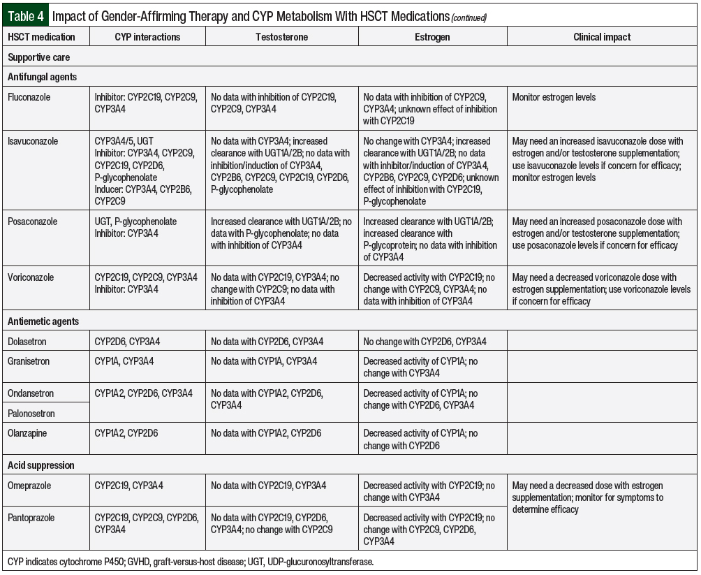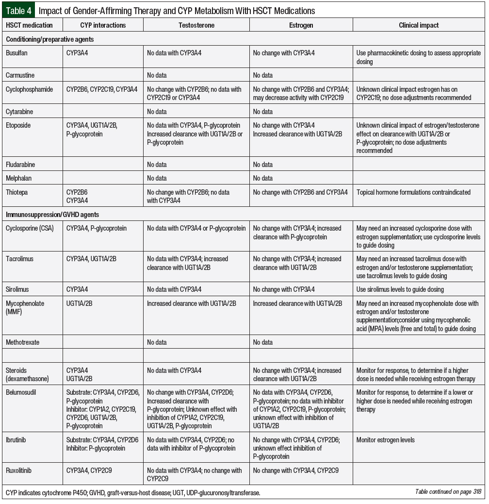 The liver cytochrome P450 (CYP) metabolic system is the primary site for drug metabolism. In the cisgender population, sex-related CYP metabolism has demonstrated differences based on the levels of hormones present.9 This has also been demonstrated with pregnancy-related altered CYP metabolism coinciding with hormone fluctuations.9 In transgender adults, there is a lack of data on the influence of hormonal therapy on CYP metabolism, with most recommendations extrapolated from cisgender patient data. Transgender adults undergoing HSCT could have changes in drug metabolism during hormone therapy; however, the clinical significance of these changes is unknown. Potential drug interactions from CYP metabolism for chemotherapy regimens and supportive care for undergoing HSCT are summarized in Table 4.