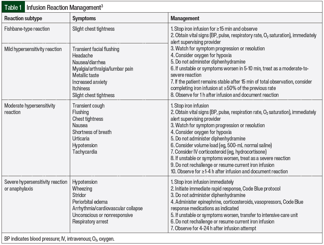 IV iron products should only be administered when trained personnel and rescue therapies are immediately available for the treatment of anaphylaxis and/or other hypersensitivity reactions.4 As best practice, all patients should be assessed for infusion reactions every 15 minutes during an infusion and should be observed for at least 30 minutes after an infusion.3 For any of the 4 reaction subtypes, it is crucial to pause or stop the infusion at the first signs of an infusion reaction. Steps for the management of infusion reactions are outlined in Table 1.