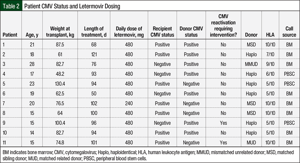 In our study, 4 patients had low-level reactivation of CMV while receiving letermovir prophylaxis; however, all of these individuals’ CMV subsequently became undetectable on repeated testing without any intervention. Of the 4 patients, 3 had single isolated CMV quantitative PCR levels of <137 IU/mL, whereas 1 patient had a peak level of 708 IU/mL. CMV reactivation requiring intervention occurred in 2 (18.2%) patients, who had CMV reactivation at least 30 days after the discontinuation of letermovir treatment, at 30 days and 113 days. The donor sources for these 2 patients included a haploidentical peripheral blood transplant with a 5/10 HLA–mismatched sibling donor and a matched unrelated donor bone marrow transplant with a 10/10 HLA–matched donor.