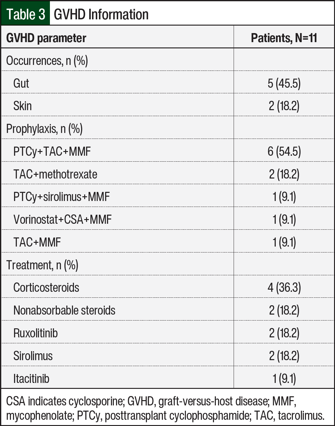 All patients received standard prophylaxis for GVHD per our institutional protocols, depending on the donor source. Grades 2 to 4 acute GVHD, as classified on presentation and reported in the patients’ charts, occurred in 5 (45.6%) of the 11 patients, who primarily received treatment with 1 to 2 mg/kg daily of systemic corticosteroids (Table 3). All 5 patients had gut GVHD, and 2 of the 5 patients also had skin GVHD. Of these 5 patients, 2 had CMV reactivation. Both patients who had CMV reactivation were not receiving letermovir therapy at the time of reactivation. Patient 9 was receiving prednisone, tacrolimus, budesonide, and ruxolitinib at the time of CMV reactivation. This patient had previously received sirolimus in place of tacrolimus; but because of an AE, treatment with sirolimus was transitioned back to tacrolimus.