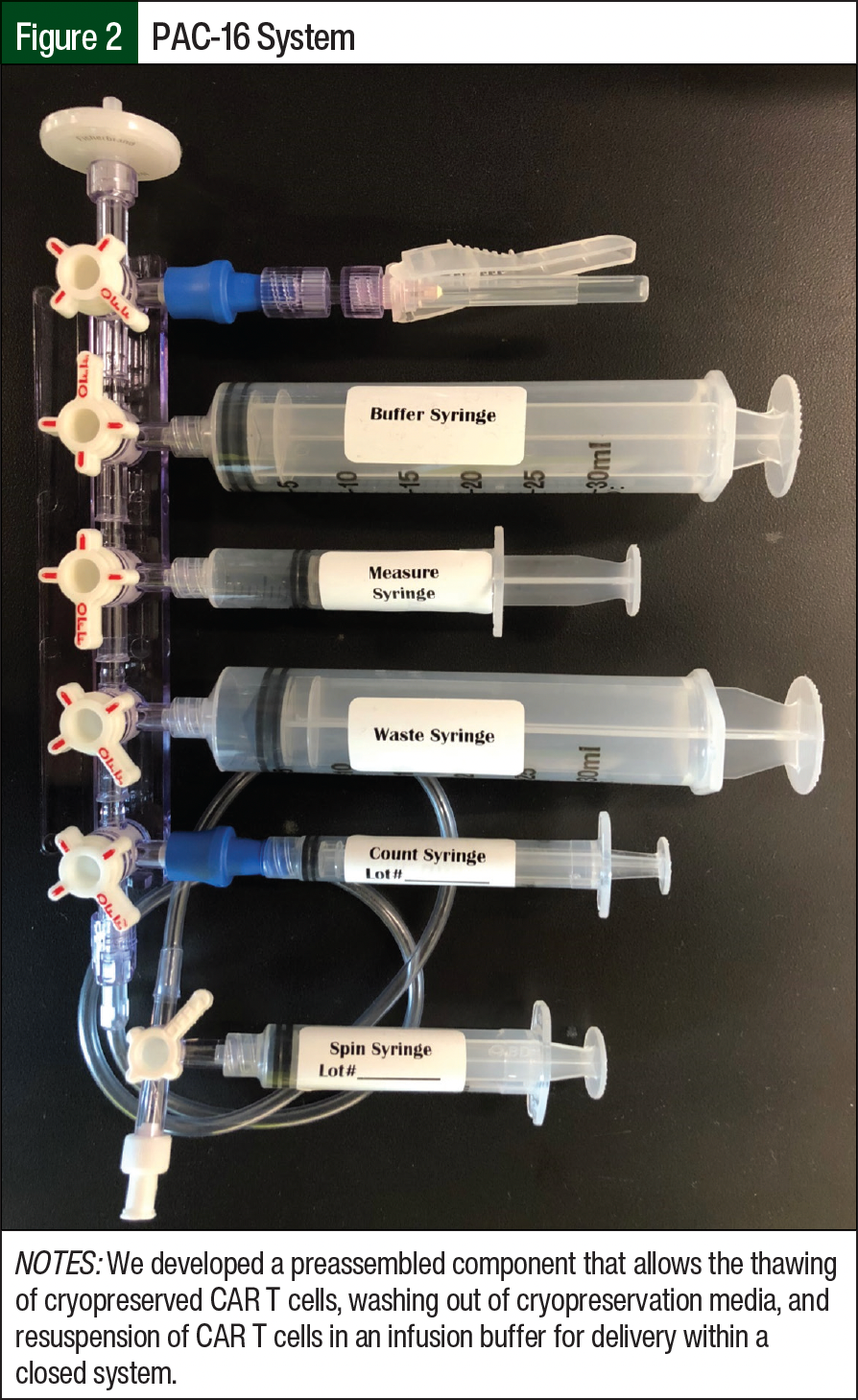 Because the CAR T cells are cryopreserved in a medium containing 5% dimethyl sulfoxide (DMSO), the first goal was to reduce this concentration for infusion to minimize the risk for DMSO-related AEs.14 We developed a preassembled component (PAC), the PAC-16, that would allow us to thaw the cryopreserved CAR T cells, wash out the cryopreservation media, and resuspend the T cells in an infusion buffer for delivery (Figure 2). This PAC allowed the process to be performed in a closed-system manner, thereby increasing safety and reducing sterility risks before delivery. The cells were thawed and processed through the PAC and washed twice before final resuspension and count (ie, the thaw-and-wash process). This recovery count was used to determine the volume for infusion. During the development and qualification of this PAC, samples were removed at various points in the process and were sent to an independent laboratory for analysis of the DMSO content. From these analyses, the final infusion concentration of DMSO was reduced to approximately 1%.