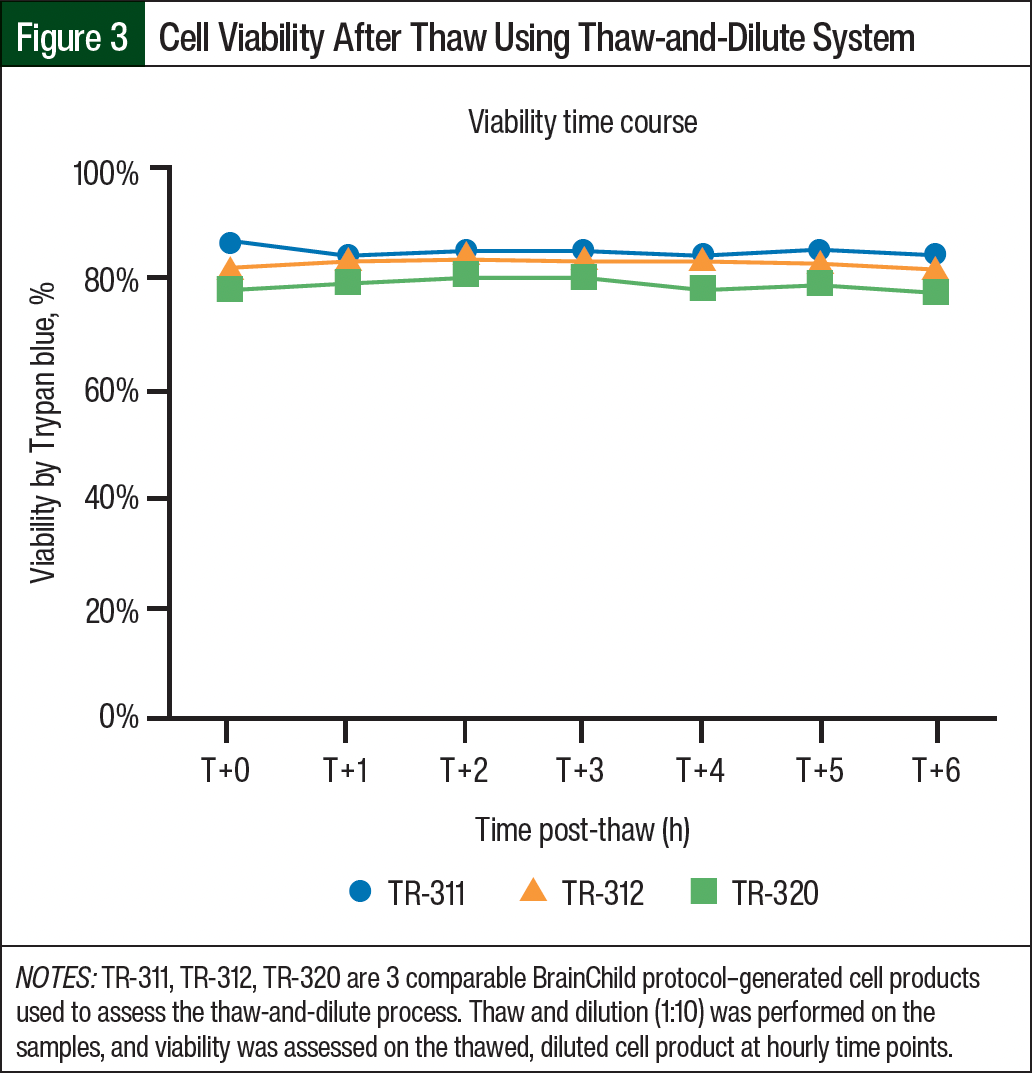 Viability assessments during the process qualification were performed by TCPC for 3 different samples from the same cryopreserved material. The cell viability was uniformly >70% (range, 74.3%-75.8%) and was always within the <10% range of the cell viability assessed at the time of cryopreservation. In comparison, the samples tested during the process qualification by thaw and wash demonstrated cell viability of 72.4% to 75.8%. This viability was preserved through 6 hours post thaw (Figure 3), which is much longer than the time from thaw to patient infusion (approximately 1 hour).