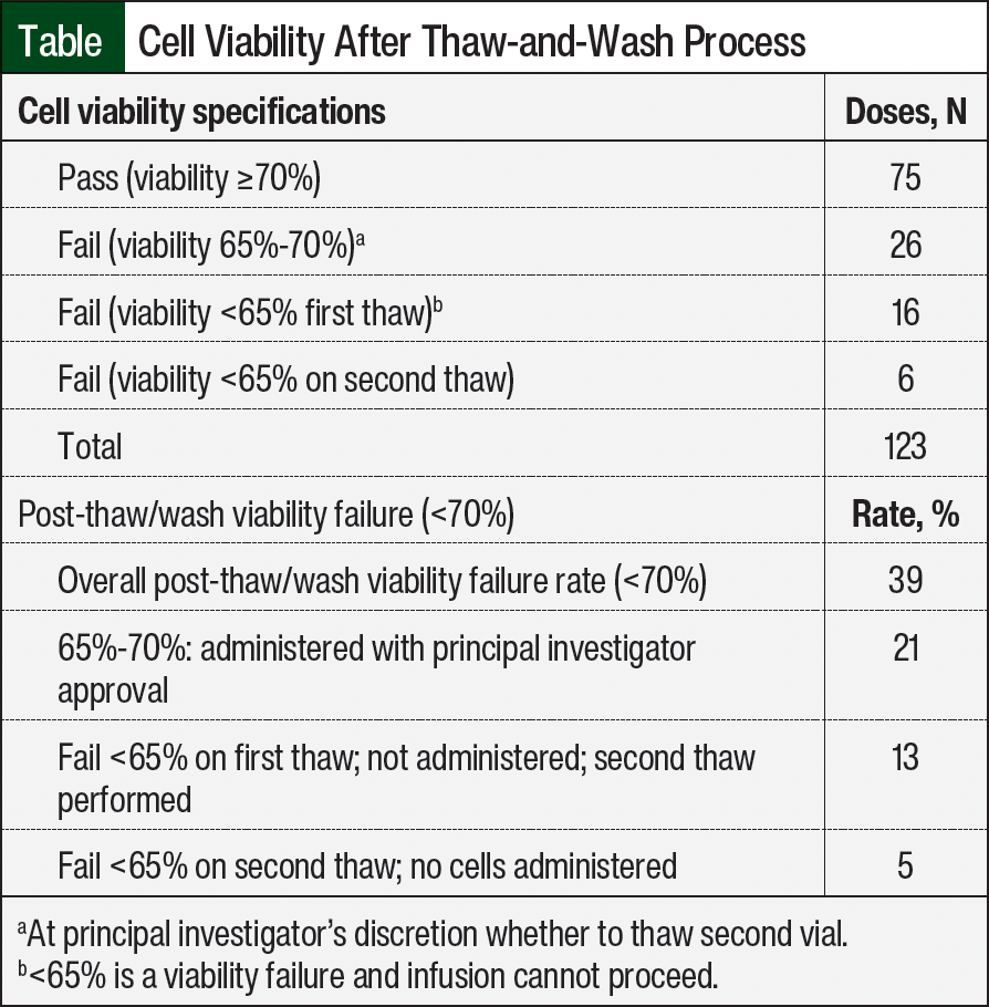 A major challenge of the thaw-and-wash process was the procedure’s negative effect on cell viability. If cell viability did not meet the specification of ≥70%, the principal investigator was contacted to determine whether to move forward with the infusion or to perform a second thaw-and-wash procedure using a second vial. Under this system, 123 doses were prepared for 13 subjects (Table). In all, 75 (61%) doses met the viability specification of ≥70%. Within the failed 39% of doses, 26 (21%) doses had 65% to 70% viability but were administered with the principal investigator’s approval, 16 (13%) doses had a viability of <65% and required the principal investigator’s approval for a second thaw, and 6 (5%) doses did not meet the viability of >65% on the second thaw and no dose was administered.