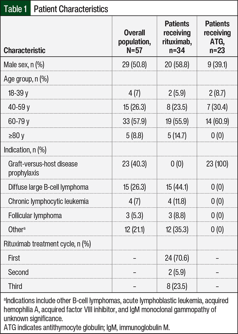 This study was a pharmacist-led, observational, single-center, retrospective chart review conducted at Atrium Health Wake Forest Baptist. The institutional review board and oncology protocol review committee at Atrium Health Wake Forest Baptist approved the study protocol. The patients were identified from a report generated through the electronic medical records (EMRs) to include patients whose treatment plans contained rituximab or ATG. The data were collected from a review of the medication records and nursing and providers’ notes. All end points were analyzed using descriptive statistics.