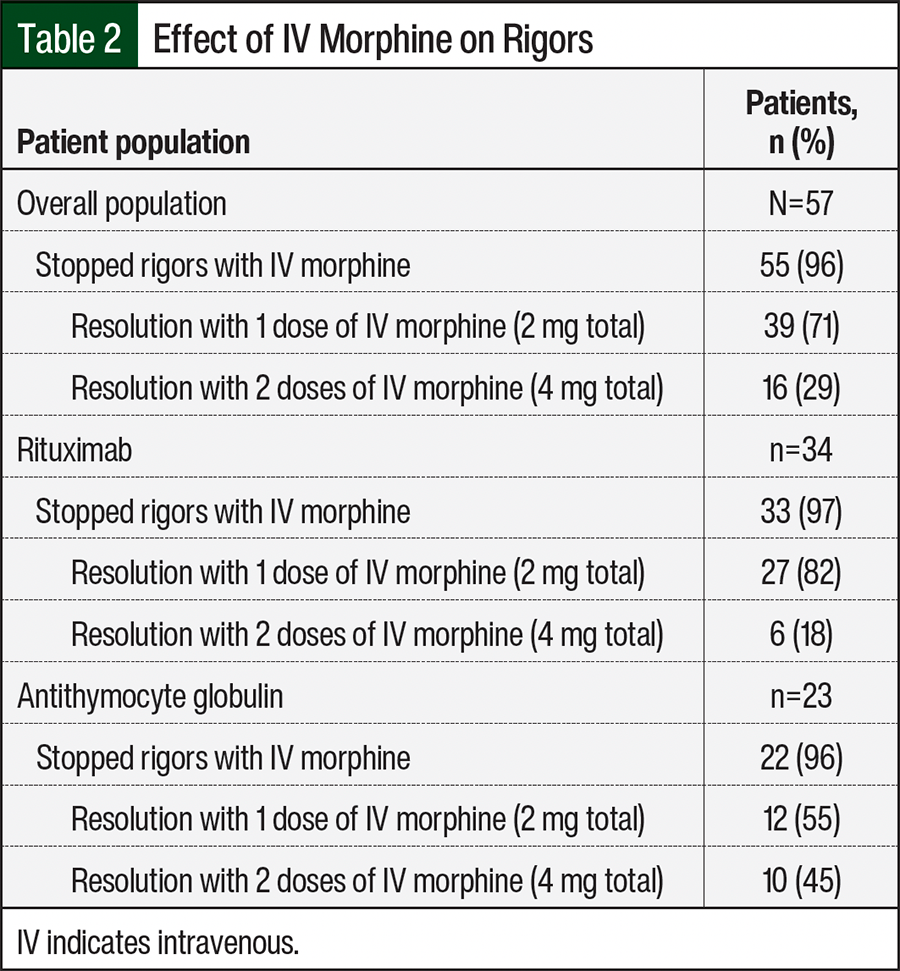 There is a paucity of information regarding the treatment of rigors associated with rituximab and ATG, with most data being extrapolated from patients who had postanesthesia rigors. This retrospective analysis provides supporting evidence that treatment with morphine is an effective alternative to meperidine, and the use of morphine may avoid the potential AEs associated with meperidine. However, this study was not designed to prove the noninferiority of morphine versus meperidine because there is a low rate of meperidine use at our institution. Although there remains a concern for the accumulation of morphine and meperidine in the setting of renal dysfunction, the primary concern for morphine accumulation is respiratory depression, which treatment with meperidine in lieu of morphine would not mitigate, and respiratory depression was not observed in this review.