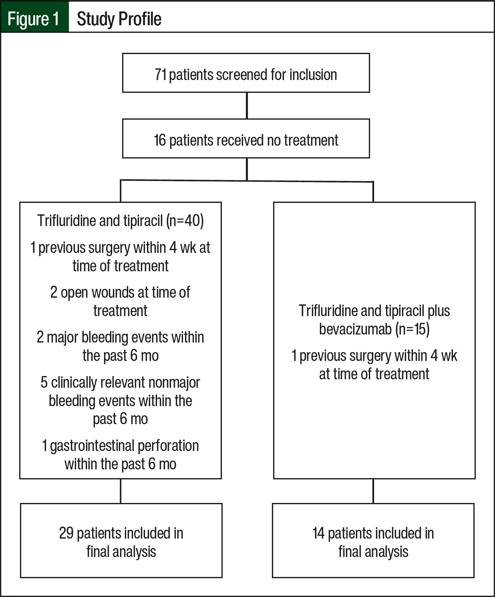 Patients aged 18 to 89 years were included if they had histologically confirmed and previously treated metastatic CRC, as well as if they were receiving active treatment with trifluridine and tipiracil. Patients were excluded if they were pregnant, incarcerated, had open wounds or surgery within 4 weeks of initiating treatment with trifluridine and tipiracil, or had major bleeding, clinically relevant nonmajor bleeding, gastrointestinal perforation, myocardial infarction, or cerebrovascular accident in the 6 months before initiating therapy with trifluridine and tipiracil. Major bleeding and clinically relevant nonmajor bleeding were defined by the International Society on Thrombosis and Haemostasis.10,11