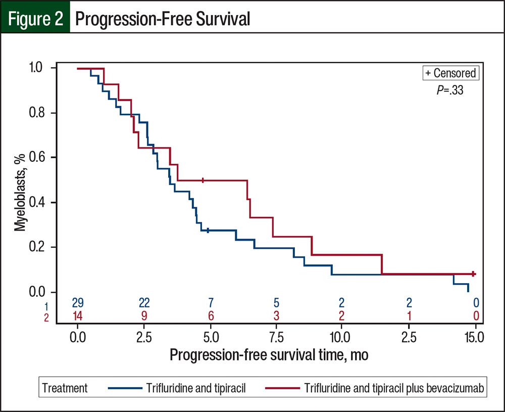 The patients’ adverse events (AEs) were consistent with previously published literature5-8 on trifluridine and tipiracil plus bevacizumab or trifluridine and tipiracil alone. There was a higher prevalence of neutropenia among patients who received trifluridine and tipiracil alone (grade 3, 41.4%; grade 4, 13.8%) than those who received trifluridine and tipiracil plus bevacizumab (grade 3, 28.6%; grade 4, 7.1%). There were more incidents of grade 3 anemia in the cohort that received trifluridine and tipiracil alone than in those who received trifluridine and tipiracil plus bevacizumab (31% vs 21.4%, respectively). There was a higher proportion of grade 3 thrombocytopenia after treatment with trifluridine and tipiracil plus bevacizumab than after treatment with trifluridine and tipiracil (14.3% vs 6.9%, respectively). Grade 2 hypertension was the most frequent AE, occurring in 44.8% of patients who received trifluridine and tipiracil and in 57.1% of those who received trifluridine and tipiracil plus bevacizumab.