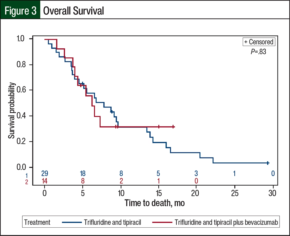 The rates of venous thromboembolism were higher in the trifluridine and tipiracil plus bevacizumab arm than in the arm without bevacizumab (21.4% vs 10.3%, respectively). There were no cases of major bleeding events noted in either group, but there were 3 cases of clinically nonrelevant major bleeding in the patients receiving trifluridine and tipiracil alone. There were no cases of proteinuria in those receiving trifluridine and tipiracil plus bevacizumab. A dose delay occurred in 72.4% of patients who received trifluridine and tipiracil and similarly in the group that received trifluridine and tipiracil plus bevacizumab (71.4%). A total of 8 (57.1%) patients in the trifluridine and tipiracil plus bevacizumab arm and 13 (44.8%) patients in the trifluridine and tipiracil arm required a dose modification. The most frequent reason for dose delays or modifications included neutropenia and fatigue.