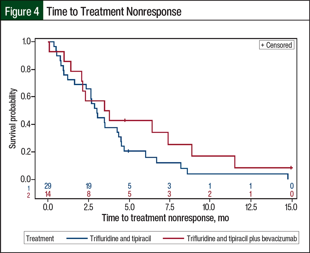 The median PFS was 3.48 months (95% CI, 2.63-4.50 months) for the patients who received trifluridine and tipiracil compared with 5.09 months (95% CI, 2.04-7.36 months) for those who received trifluridine and tipiracil plus bevacizumab (P=.33; Figure 2). The median OS for patients receiving trifluridine and tipiracil was 7.75 months (95% CI, 3.91-9.59 months) compared with 6.21 months for patients receiving trifluridine and tipiracil plus bevacizumab (95% CI, 3.71 months-not estimable; the upper limit could not be obtained because the confidence curve did not pass the median; P=.83; Figure 3). The median time to treatment nonresponse was 2.99 months (95% CI, 1.61-4.34 months) for the patients who received trifluridine and tipiracil and 3.63 months (95% CI, 1.38-8.84 months) for those who received trifluridine and tipiracil plus bevacizumab (Figure 4). The final disposition of the individual patients is shown in Figure 5.