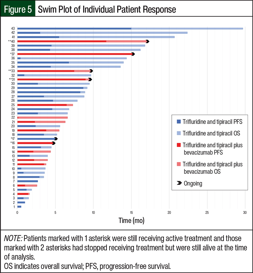 It is likely that our study’s results differed from other published reports because of differences in the study populations. The patients who received trifluridine and tipiracil alone in this study may have been more physically fit at baseline or may have had more favorable biology, as suggested by the higher number of earlier treatments, when compared with the patients who received trifluridine and tipiracil plus bevacizumab (5 vs 3.5, respectively).