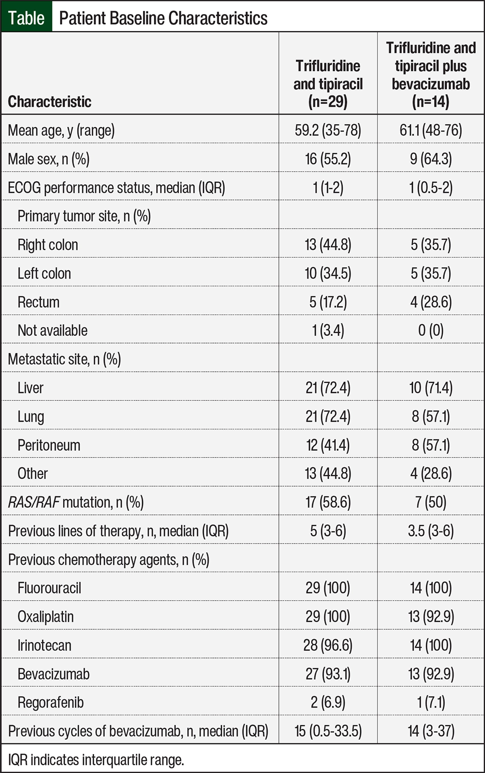 There were 71 patients who had trifluridine and tipiracil treatment prescribed and were screened for study inclusion. Ultimately, 43 patients were included in the study; most of the patients were excluded from the study because they did not start treatment (Figure 1). Most of the patients’ baseline characteristics were similar between the 2 treatment groups (Table). The median patient age was approximately 60 years, more than 50% of the patients were men, and the median ECOG Performance Status Score was 1. Right-sided tumors were more common in those receiving trifluridine and tipiracil, and rectal cancer was more common among those receiving trifluridine and tipiracil plus bevacizumab. The most common metastatic sites included the liver, lung, and peritoneum.