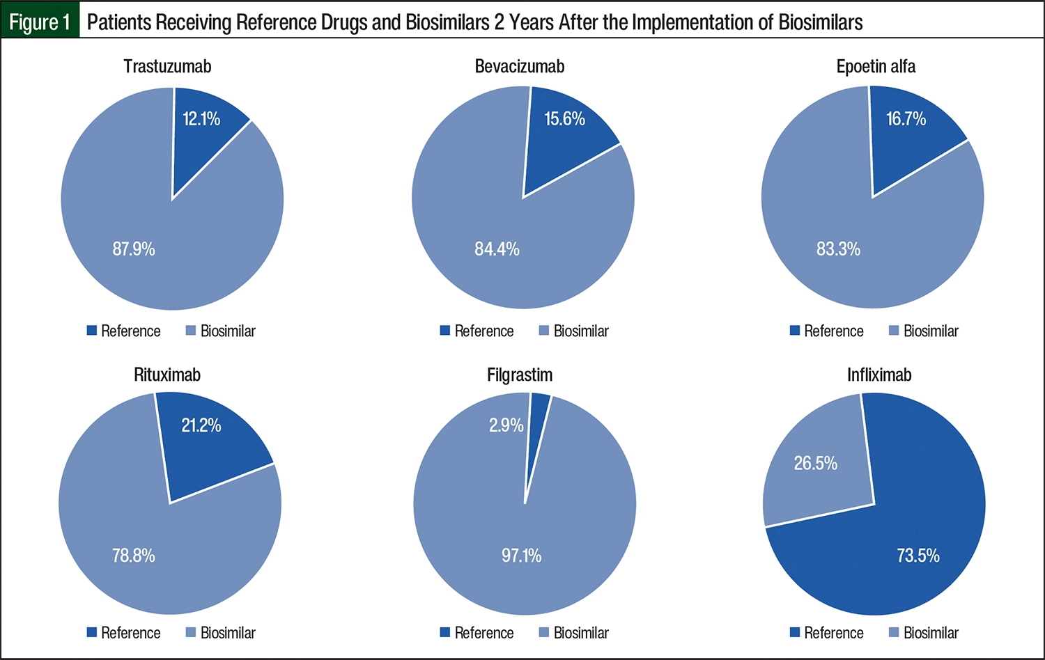 When compared with commercial industry benchmarks, our approach yielded improved or equivalent conversion to biosimilars across all market categories.12 We had greater success compared with benchmarks as a result of driving medication selection from reference drugs to biosimilars within the EHR, leveraging step-therapy prior authorization for reference drugs for bevacizumab and trastuzumab, having a multimodal approach for patients who remained on reference drugs 1 year after the implementation of biosimilars, and case-management approaches.12 Our strategies achieved ≥80% biosimilar utilization for bevacizumab, epoetin alfa, filgrastim, rituximab, and trastuzumab. For infliximab, our strategy yielded a nearly 30% shift from reference drugs to biosimilars compared with only 5% in the industry.12 The use of infliximab biosimilars is hindered by reasons such as patient or provider hesitancy and financial disincentives.13