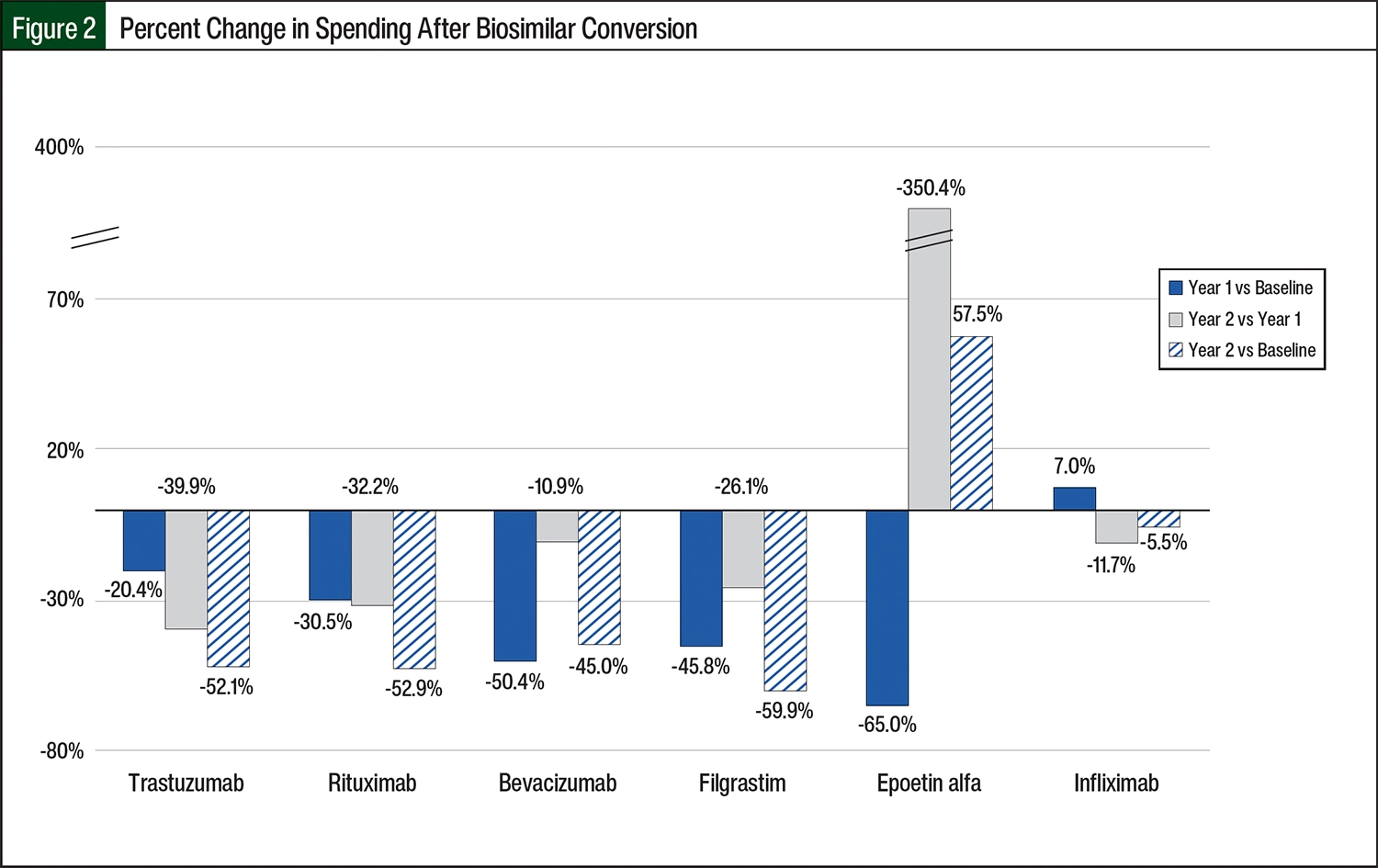 For the filgrastim category, the total spending decreased by 45.8% from baseline to year 1, 26.1% from year 1 to year 2, and 59.9% overall from baseline to year 2, resulting in $100,000 of savings to the health plan (Figure 2).