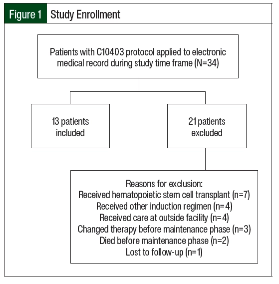 This retrospective analysis of young adults with newly diagnosed B-cell or T-cell ALL or lymphoblastic lymphoma was conducted at Cleveland Clinic Taussig Cancer Center in Cleveland, OH. The medical records of all patients aged 18 to 39 years who received C10403 induction therapy between January 1, 2015, and January 1, 2020, were reviewed. Patients who did not receive maintenance therapy per C10403 were excluded from the study.