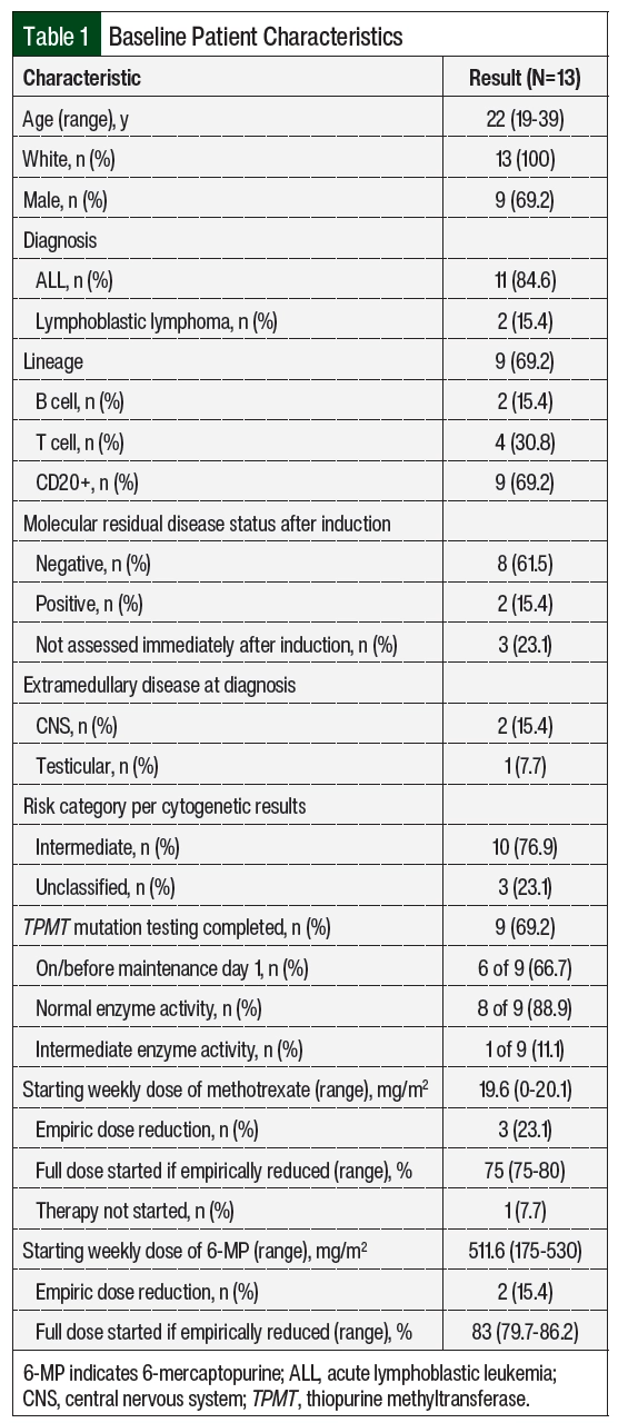 Although treatment protocols, such as C10403 mentioned above, often include guidance on dose modifications, some obscurity within adolescents and young adults exists. Adolescents and young adults can have increased difficulty with adherence, which can be a result of multiple factors, including emotional distress and social support.13,14 In addition, physician compliance with protocol adherence fluctuates and may be impacted by personal experience and observed treatment-related adverse events.15 Some reports show increased adverse events in adolescents and young adults who received pediatric-inspired protocols, however this finding is inconsistent.14,16 Ultimately, compliance to the protocol guidelines, patient adherence, and physician experience with maintenance therapy and dose adjustments vary. This leads to inconsistencies in clinical practice and changes to therapy without increased risks for progression or relapse based on the available literature statement.14,15 A recent study showed superior survival in adolescents and young adults who received pediatric-style chemotherapy instead of hematopoietic stem cell transplantation in first remission, and guidance on how to best dose adjust these patients to balance efficacy and treatment-related adverse events is needed.16 Given these uncertainties, the goal of this study was to describe real-world dose modifications for MTX and 6-MP and to assess the tolerability of maintenance therapy in young adults.