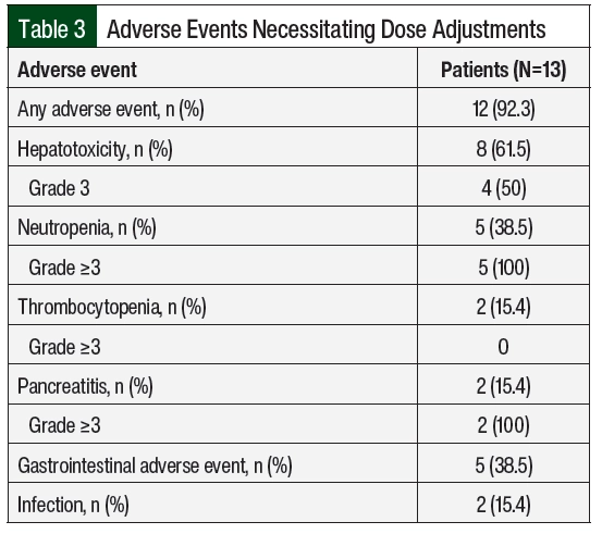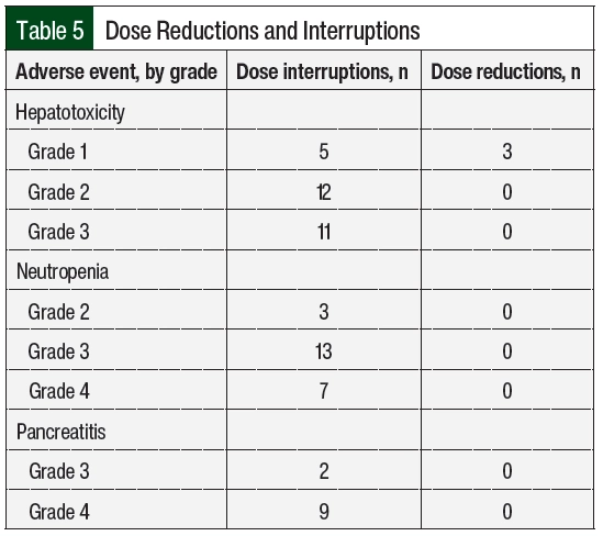 In all cases where doses were adjusted for neutropenia, dose interruptions were employed (Table 5). Most interruptions occurred with grade 3 neutropenia. The median interruption durations were 9 and 18 days for grade 3 and grade 4 neutropenia, respectively (Appendix Table S2). A total of 3 interruptions occurred with grade 2 neutropenia for a median of 13 days (range, 13-21.5 days). At the time the doses were reinitiated, 18 cases occurred with ANC >1500 cells/mm3 and 3 cases occurred with grade 3 neutropenia (ANC range, 820-860 cells/mm3). A total of 3 patients had therapy restarted at a reduced dose after the first episode of neutropenia. The doses were restarted at a reduced dose in 15 of the 23 interruptions, with a slightly greater reduction for grade 4 neutropenia than with other grades of neutropenia (Appendix Table S2) and were subsequently re-escalated in 19 cases.