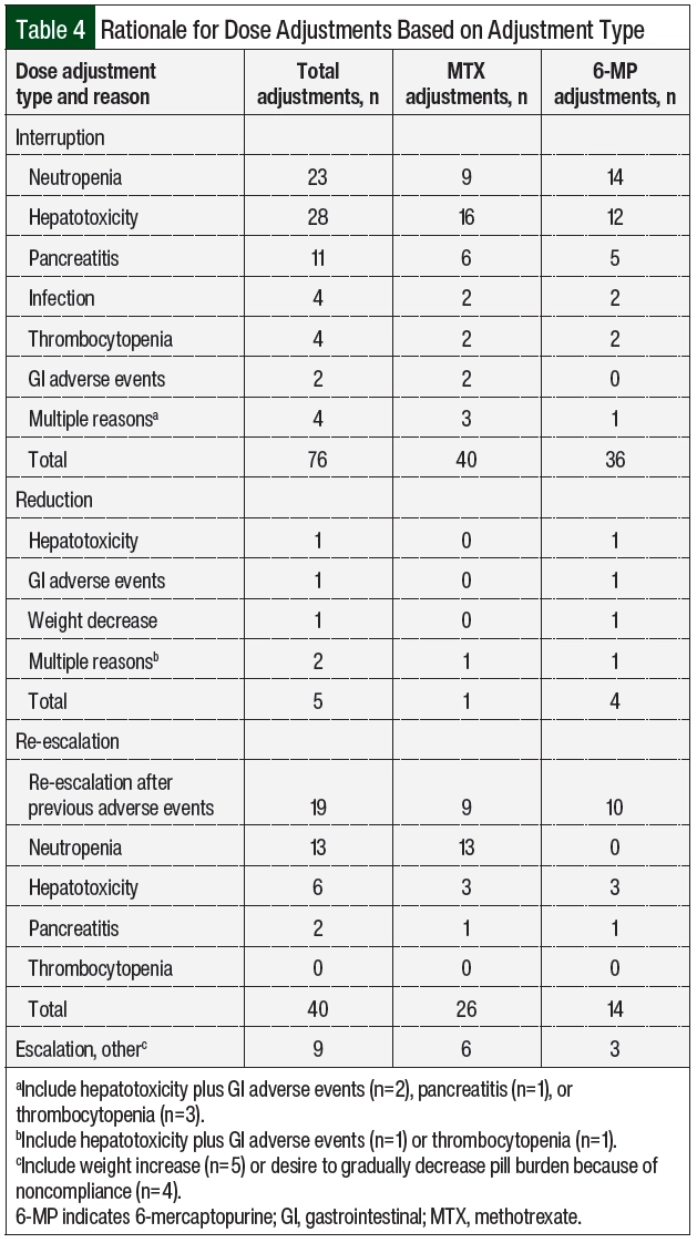 The less common adverse events that led to dose adjustments included thrombocytopenia, GI adverse events, and infection (Table 4). Grade 2 thrombocytopenia was the cause of 4 interruptions of MTX and 6-MP between 2 different patients. Therapy was held for a median of 13 days (Appendix Table S2). The doses were reduced after the first episode of thrombocytopenia in both patients. On treatment resumption, MTX was reduced in 1 patient by 50% and 6-MP was reduced in the other patient by 33.3%. GI adverse events (nausea, vomiting, and/or diarrhea) were the sole reason for dose adjustments in 3 cases (Table 4). In both cases that included treatment with MTX, therapy was held for 7 days and 16 days and was restarted with a 25% dose reduction. In the 1 case that included 6-MP, the dose was reduced by 33.3%. In all cases, therapy was modified at the same time that supportive care, such as antidiarrheal or antiemetic medications, was started, and the symptoms improved per the documentation. Infection led to interruptions 4 times during the study period among 2 of the patients (Table 4). In both patients, treatment was resumed after the infection resolved, with a total of 32 days and 8 days off therapy for each patient. There was no recurrence of infection after resumption of the treatment.