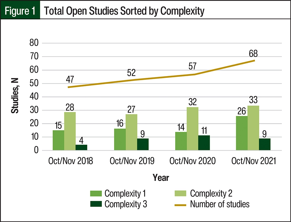 During the months of October and November from 2018 to 2021, there was an increase in the number of clinical trials open to enrollment. A total of 47 studies were open in 2018, 52 in 2019, 57 in 2020, and 68 in 2021 (Figure 1). Throughout the study time period, there was an approximately 45% increase in open studies at the site. In 2018, approximately 32% of open studies were classified as complexity level 1, 60% were complexity level 2, and 8% were complexity level 3. In 2021, the level 3 studies had increased to approximately 13%, which was almost double the number of level 3 trials in 2018.