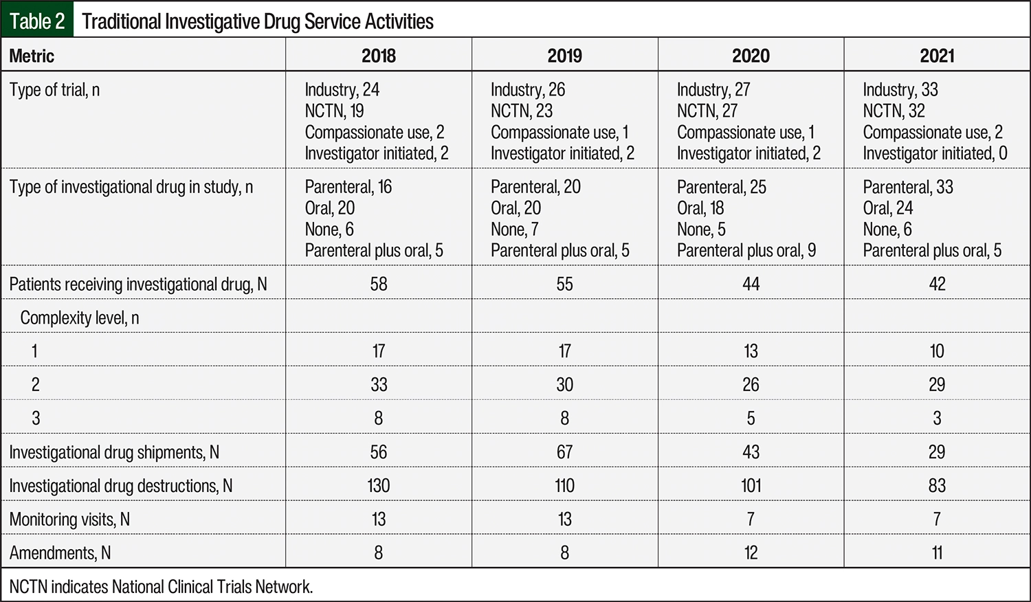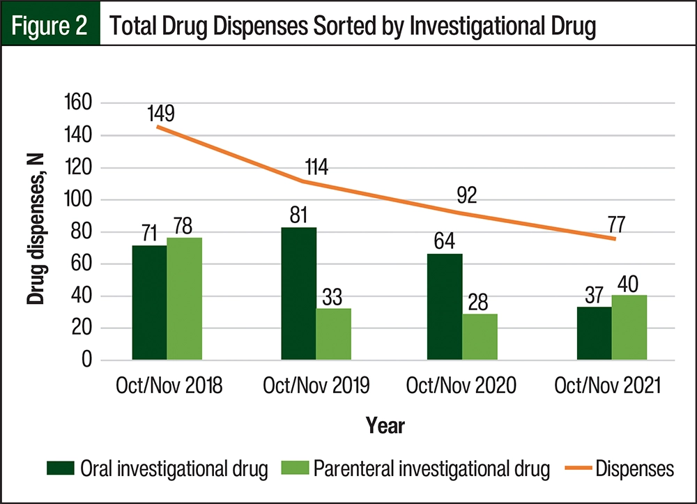 Another potential reason for the decline in total dispensations was related to sponsor allowance of larger quantities of oral investigational drugs per dispense to limit patient exposure risk. Before the COVID-19 pandemic, most study sponsors would only allow for the dispensation of 1 cycle of an oral investigational drug at each clinic visit. As a result of COVID-19 and the desire to reduce the number of in-clinic appointments, the study sponsors allowed the IDS pharmacy to dispense up to 3 months of oral investigational drugs, which contributed to the decline in annual overall dispensations.