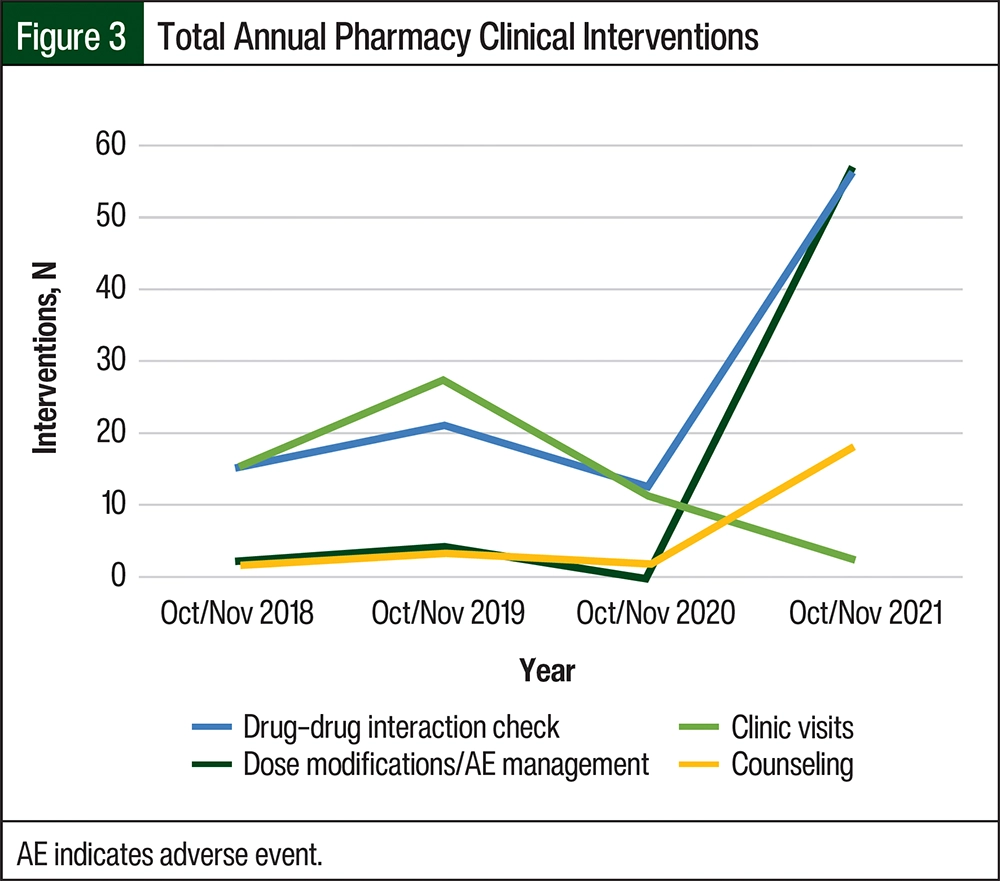 Over the duration of the study, the cumulative number of pharmacist interventions increased, including counseling, dose modifications/AE management, and drug–drug interaction checks (Figure 3). Phase 1 trial clinic visits over the study duration decreased because of the closure of 2 high-enrolling studies. From 2018 to 2020, clinical intervention data were collected from retrospective research chart reviews and internal correspondences. A formal intervention tracking process was implemented in 2021 and was used for data collection. The average time per pharmacy intervention in 2021 was 0.6 hours.