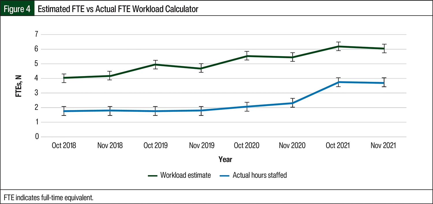 Analysis of these data provided an average weekly study maintenance time that was extrapolated for the month. Pharmacists documented the amount of time required to perform each protocol-specific task to determine the maintenance hours per study complexity level. The total number of studies opened for each month based on complexity was multiplied by the average start-up/maintenance hours to calculate an estimated workload. Based on the estimated workload calculator versus actual hours staffed, IDS pharmacy was understaffed by an average of 2 FTE staff members (Figure 4).
