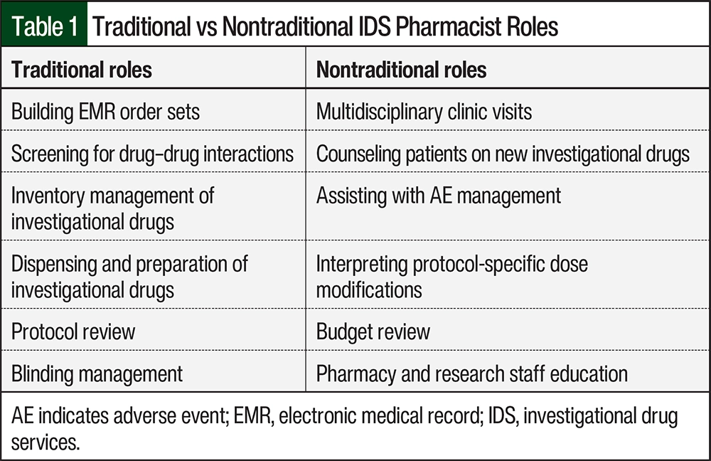 Although many institutions that conduct clinical trial research incorporate an IDS pharmacist into their workflow, few have practice models that integrate a pharmacist within their multidisciplinary team. At Avera Cancer Institute, pharmacists participate in traditional IDS services to operationalize clinical trials through building EMR order sets, screening for drug–drug interactions, and dispensing investigational drugs. In addition, IDS pharmacists also manage nontraditional responsibilities, such as attending multidisciplinary clinic visits, counseling patients on new investigational drugs, assisting with AE management, and interpreting protocol-specific dose modifications. Additional evaluation and research are needed to define nontraditional IDS responsibilities and metrics.