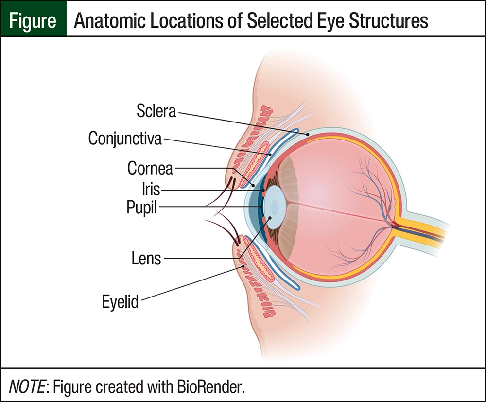 With tisotumab vedotin and mirvetuximab soravtansine, ocular AEs are primarily confined to the eye’s surface, which includes the conjunctiva, eyelids, and cornea (Figure).3,4 The conjunctiva is a thin, translucent, continuous tissue composed of squamous epithelium covering 2 parts of the eye: the palpebral or tarsal conjunctiva covers the inner surface of the eyelid and the bulbar conjunctiva covers the sclera.5 Goblet cells of the conjunctiva help provide the mucin layer for the tear film; therefore, the conjunctiva plays a large role in protecting the eye through lubrication. The cornea is a clear layer of avascular tissue covering the iris, pupil, and anterior chamber of the eye that ultimately provides a structural barrier. It is important to note that the cornea also refracts or focuses the entry of light into the eye.5