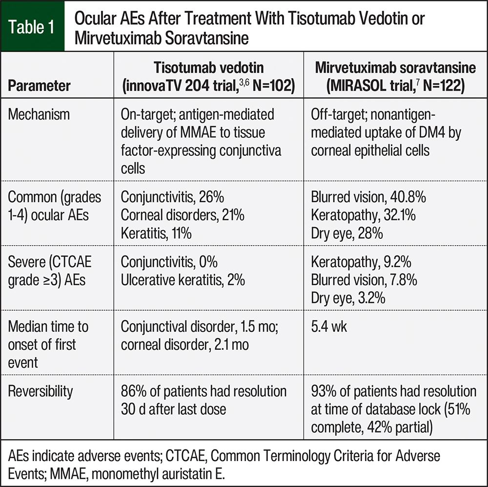 Given the rates of ocular AEs and potential effect on quality of life in patients with recurrent cancer, the clinical care of patients receiving tisotumab vedotin or mirvetuximab soravtansine requires specific and diligent pharmacologic and nonpharmacologic prevention and mitigation strategies (Table 2).