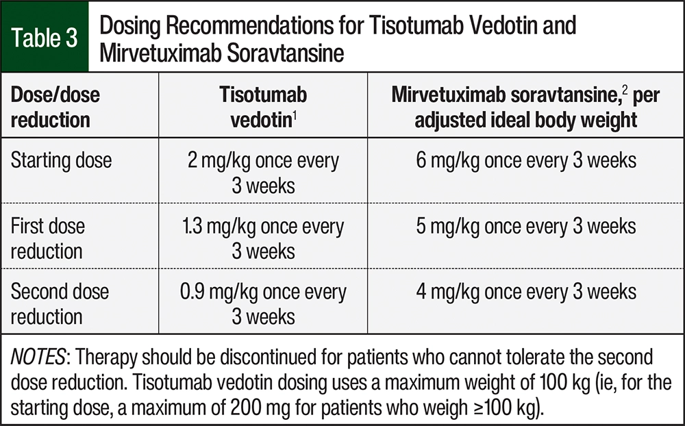 The oncology clinician should be particularly aware of the link between eyecare provider assessment and the grading of AEs and subsequent management of chemotherapy. The prescribing information for each drug provides detailed recommendations for holding therapy and dose reductions depending on the type and grade of ocular AEs (Table 3).1,2 In general, more severe AEs require dose interruption or permanent discontinuation of treatment. Notably, the FDA does not currently require a Risk Evaluation and Mitigation Strategies program for tisotumab vedotin or mirvetuximab soravtansine.