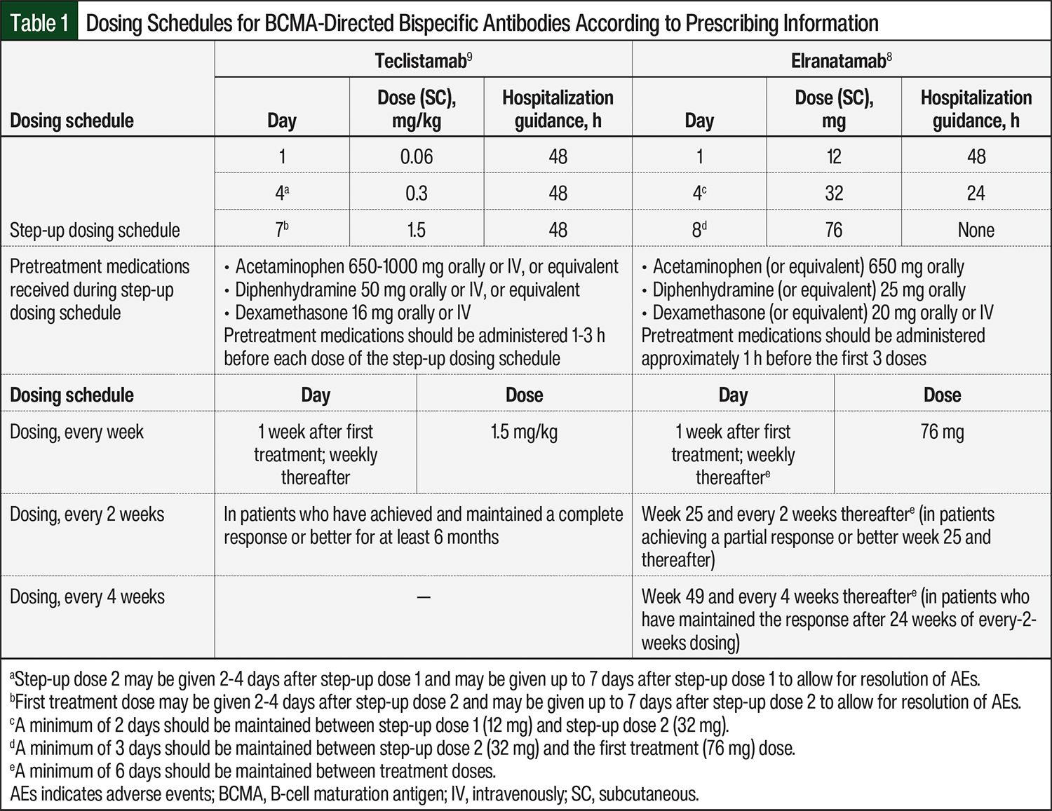 Teclistamab and elranatamab are administered as subcutaneous injections.8,9 Both drugs are available in 2 sizes of single-use, ready-to-use vials that do not need dilution before administration. Teclistamab, however, is supplied in 2 concentrations of 10 mg/mL (30 mg/3 mL) and 90 mg/mL (153 mg/1.7 mL).9 The concentration of elranatamab is 40 mg/mL in both vial sizes (76 mg/1.9 mL and 44 mg/1.1 mL).8 Because the dosing of teclistamab is based on actual body weight, the total dose, injection volume, and the number of vials must be calculated at each administration.9 By contrast, elranatamab is administered as a fixed dose.8 The dosing for both agents is initiated according to a step-up schedule (Table 1).8,9 During the step-up dosing schedule, pretreatment medications (consisting of antipyretics, a histamine 1-receptor antagonist, and corticosteroids) are administered to reduce the risk for CRS.26,27 The prescribing information for teclistamab and elranatamab include differing durations of hospitalization8,9; securing a bed is therefore a component of initiating BCMA-directed bispecific antibody treatment (Table 1).8,9 However, strategies for outpatient step-up dosing are an ongoing area of investigation.28,29