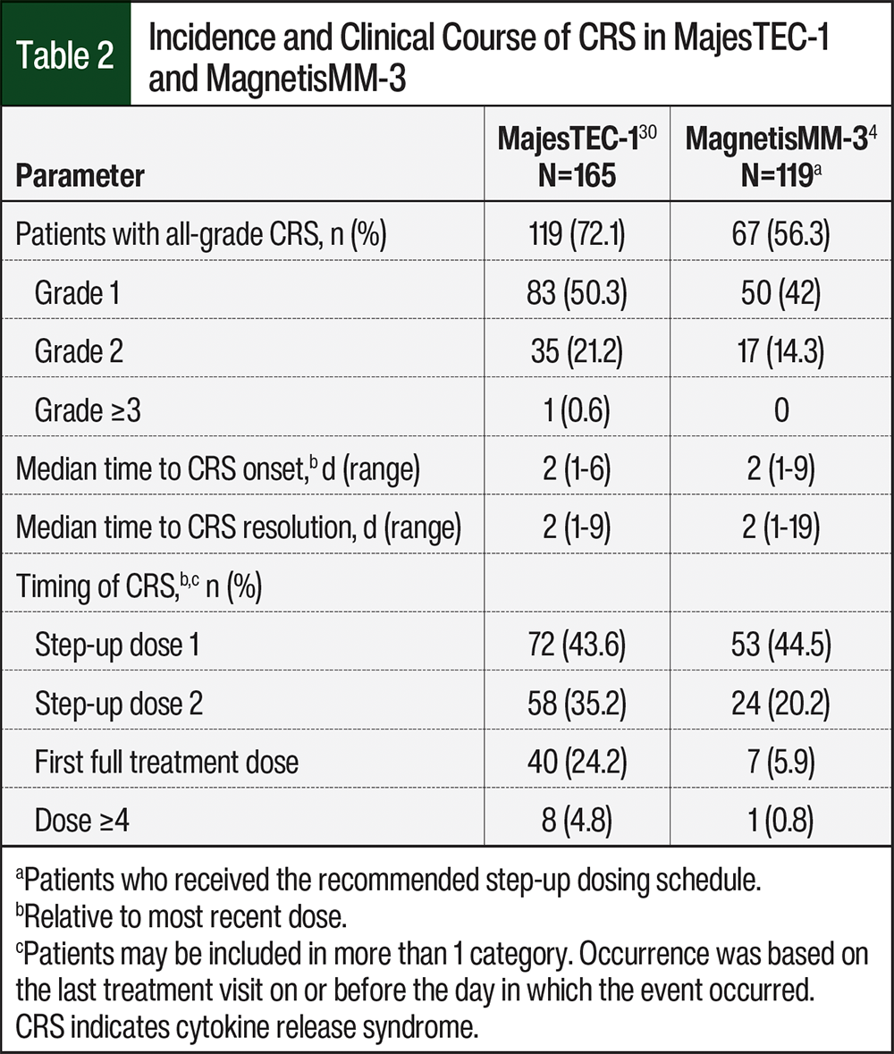 In patients who received the step-up dosing schedule in the MajesTEC-1 and MagnetisMM-3 studies, the reported incidences of CRS were 72.1% and 56.3%, respectively (Table 2).4,30 Although CRS is common with BCMA-directed bispecific antibodies, the events are typically low grade. Differing approaches to step-up dosing result in the predictability of the timing of CRS varying by agent; however, most events occur with step-up doses of BCMA-directed bispecific antibodies (Table 3).8,9 No grade 4 or 5 CRS events occurred in the MajesTEC-1 or MagnetisMM-3 clinical trials.4,30