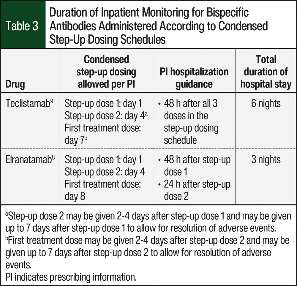 The administration of step-up dosing and monitoring should be tailored based on the resources available and on patients’ needs. Reasonable approaches include admitting patients for step-up dose administration and monitoring; administering step-up dosing on an outpatient basis and admitting the patient for monitoring immediately thereafter; and administering step-up dosing and monitoring entirely in the outpatient setting if resources allow for rapid assessment, admission, and intervention in the event of CRS.