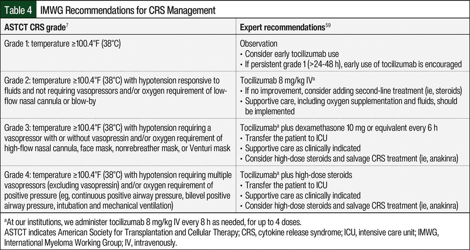 The management of grade 1 CRS includes supportive care and tocilizumab for those patients who did not receive tocilizumab prophylactically. Supportive care measures for grade 1 CRS include intravenous fluids, empiric antibiotics, and infectious workup, and the symptomatic management of constitutional symptoms. Reasonable approaches to managing CRS that is refractory to tocilizumab include the addition of dexamethasone or repeat dosing of tocilizumab every 8 hours for up to 3 or 4 doses. High-grade CRS is unlikely with BCMA-directed bispecific antibodies, but it generally requires management in a critical care setting in which the approach should follow the prescribing information and the current practice guidelines (Table 4).