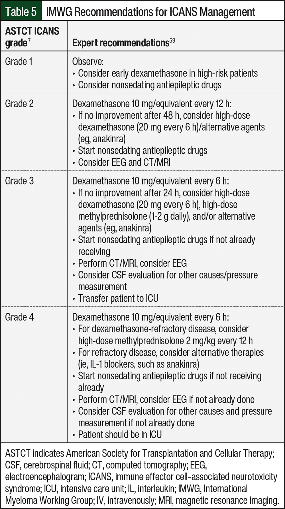 For grade 1 ICANS, treatment with corticosteroids is appropriate. High-grade or refractory ICANS should be managed according to the prescribing information and expert guidelines (Table 5).