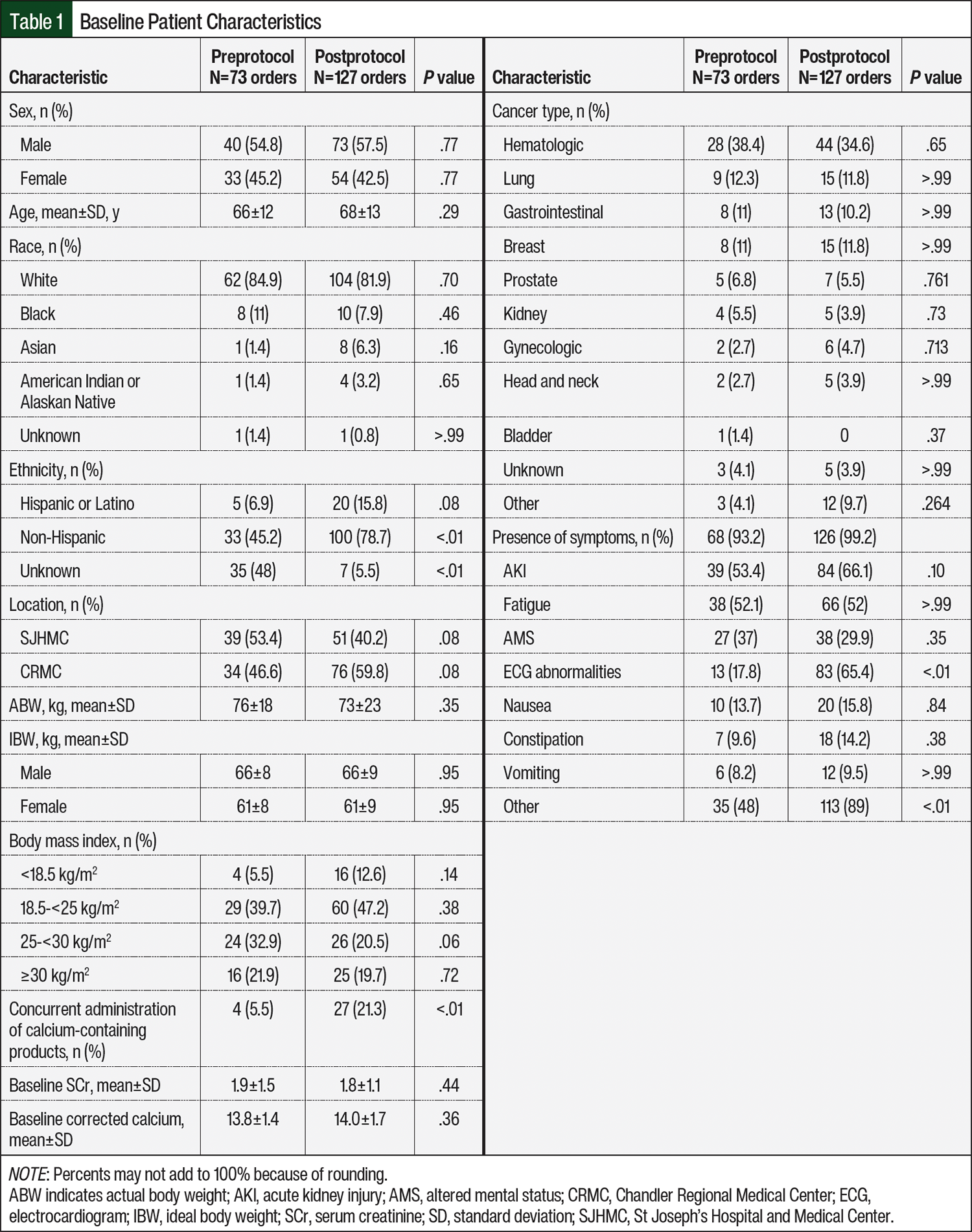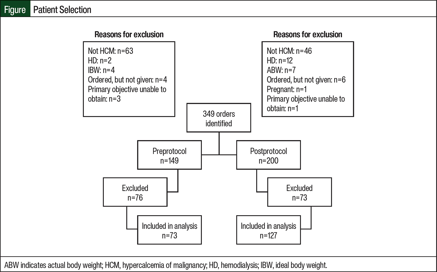The institutional review board of the hospital previously approved the study. This is a multicenter, retrospective, noninferiority, pre- and post-quasiexperimental study conducted at St Joseph’s Hospital and Medical Center (SJHMC) in Phoenix, AZ, and Chandler Regional Medical Center (CRMC) in Chandler, AZ. A discern analytics report was used to identify patients who had calcitonin ordered at the study sites during the preprotocol (2014-2016) and postprotocol (2018-2020) time frames. The calcitonin dosing protocol using IBW was implemented at the study’s sites in 2017. Adults admitted to SJHMC or CRMC who received an injectable form of calcitonin for the treatment of HCM were included in the analysis. Patients were excluded from the study if they were pregnant, they were undergoing dialysis, IBW dosing was used in the preprotocol cohort, or if actual body weight dosing was used in the postprotocol cohort.
