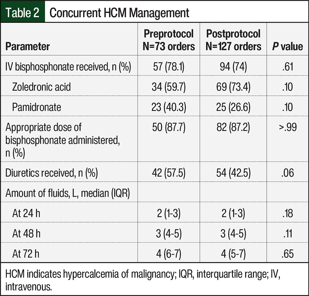 The median numbers of doses per order were 4 in the preprotocol group and 3 in the postprotocol group. The omission of the fourth calcitonin dose was decided by the provider’s discretion outside of the protocol. Treatment with IV bisphosphonates, which included zoledronic acid or pamidronate, was received by 78.1% and 74% of patients in the preprotocol and postprotocol groups, respectively (P=.61; Table 2). Of the patients who received a bisphosphonate, approximately 87% in both cohorts received appropriate doses. The most frequent reason for inappropriate bisphosphonate dosing was underdosing in the setting of mild-to-moderate renal impairment that did not warrant dose reduction. Diuretics were received by approximately 57.5% and 42.5% of patients in the preprotocol and postprotocol groups, respectively. The patients with HCM also received IV fluids, with a median of 4 L at 72 hours. The full details of the concomitant HCM management are summarized in Table 2.