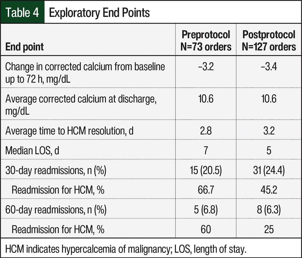 Between the preprotocol and postprotocol implementation cohorts, there was no statistical difference in the corrected calcium levels (11.4 mg/dL vs 11.3 mg/dL, respectively; P=.86) or the decrease in corrected calcium (2.4 mg/dL vs 2.7 mg/dL, respectively; P=.26) after 48 hours of calcitonin administration (Table 3). Also, there was no difference in the exploratory end points (Table 4). The readmission rates for HCM at 30 days and 60 days were lower in the postprotocol cohort, as is shown in Table 4.