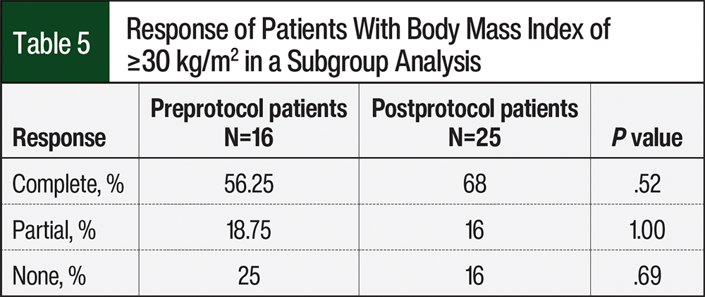 In a subgroup analysis of patients with a body mass index ≥30 kg/m2, there were 16 patients and 25 patients in the preprotocol and postprotocol groups, respectively (Table 5). The CR rate was numerically higher in the postprotocol group than in the preprotocol group (68% vs 56.25%, respectively; P=.52), the partial response was similar between the cohorts (16% vs 18.75%, respectively; P=1.00), and no response was higher in the preprotocol group (25% vs 16%; P=.69).